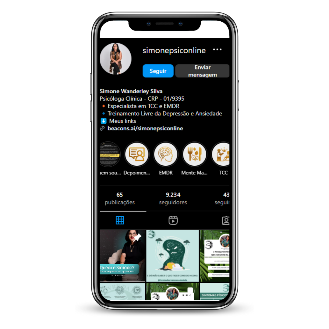 Fiz terapia com a Dra Simone e estou de alta, no mês de junho de 2024, tive vários ganhos com a terapia de TCC e EMDR como por exemplo: Estou mais pro ativo com relação a organização, hoje lido melhor com situações de imprevisto, não me estresso como antes, diminui as reclamações, e aprendi a pensar de forma mais flexível, não fico procrastinando como antes, estou conscientemente evitando situações de stress que me geravam ansiedade, aprendi a aproveitar os ambientes da minha casa, aprendendo a relaxar, aprendi a trabalhar meus relacionamentos afetivos (esposa e filhos) hoje lido com mais paciência com meus filhos e dedicando tempo com qualidade, e aprendi a não catastrofizar (pensamentos negativos do futuro que me geravam ansiedade). Iniciei a terapia com depressão severa, e no início do ano de 2023 já não me encontrava com depressão e ansiedade e me mantenho em equilíbrio, hoje durmo bem sem uso de medicação para dormir. Todas as expectativas que trouxe para a terapia foram atingidas e algumas em andamento como ter retomado atividade física. Descobri com a Dra Simone que tenho TDAH e agora também estou medicado o que me trás mais qualidade de vida, e aprendi estratégias para lidar com isso. Recomendo a terapia me ajudou muito.